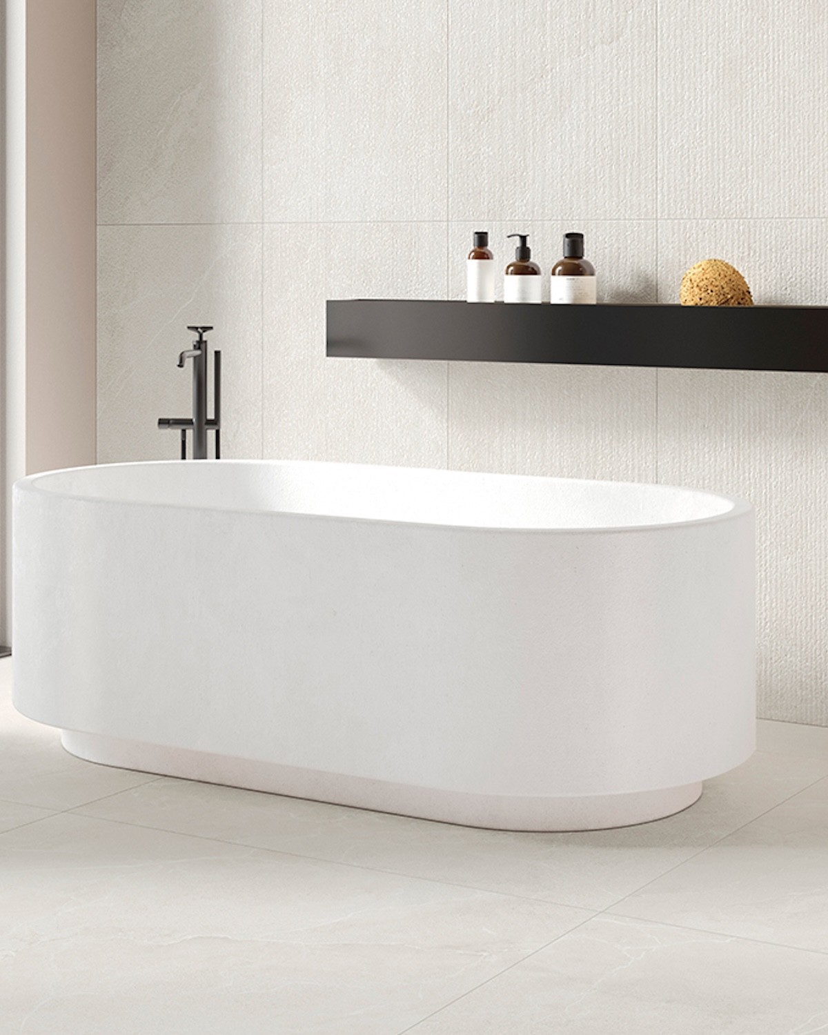 Combinado con los acabados lisos de la colección, Millerighe permite diseñar proyectos coherentes y equilibrados, manteniendo la estética piedra como hilo conductor. Su superficie rectificada asegura una integración impecable en baños, salones y negocios con un resultado final de minimalismo elegante y duradero.