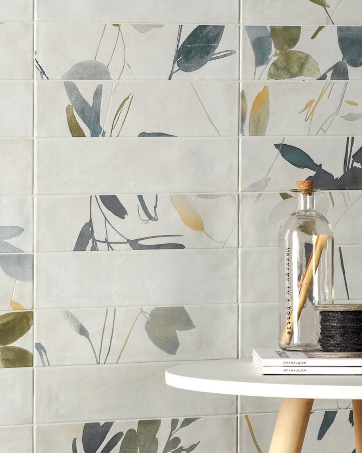 El diseño Ramage se construye a partir de una composición botánica estilizada, distribuida sobre pequeñas piezas cerámicas que generan un ritmo visual continuo. El motivo no se presenta como un patrón rígido, sino como una sucesión de fragmentos gráficos que aportan movimiento, profundidad y una lectura orgánica del plano vertical.