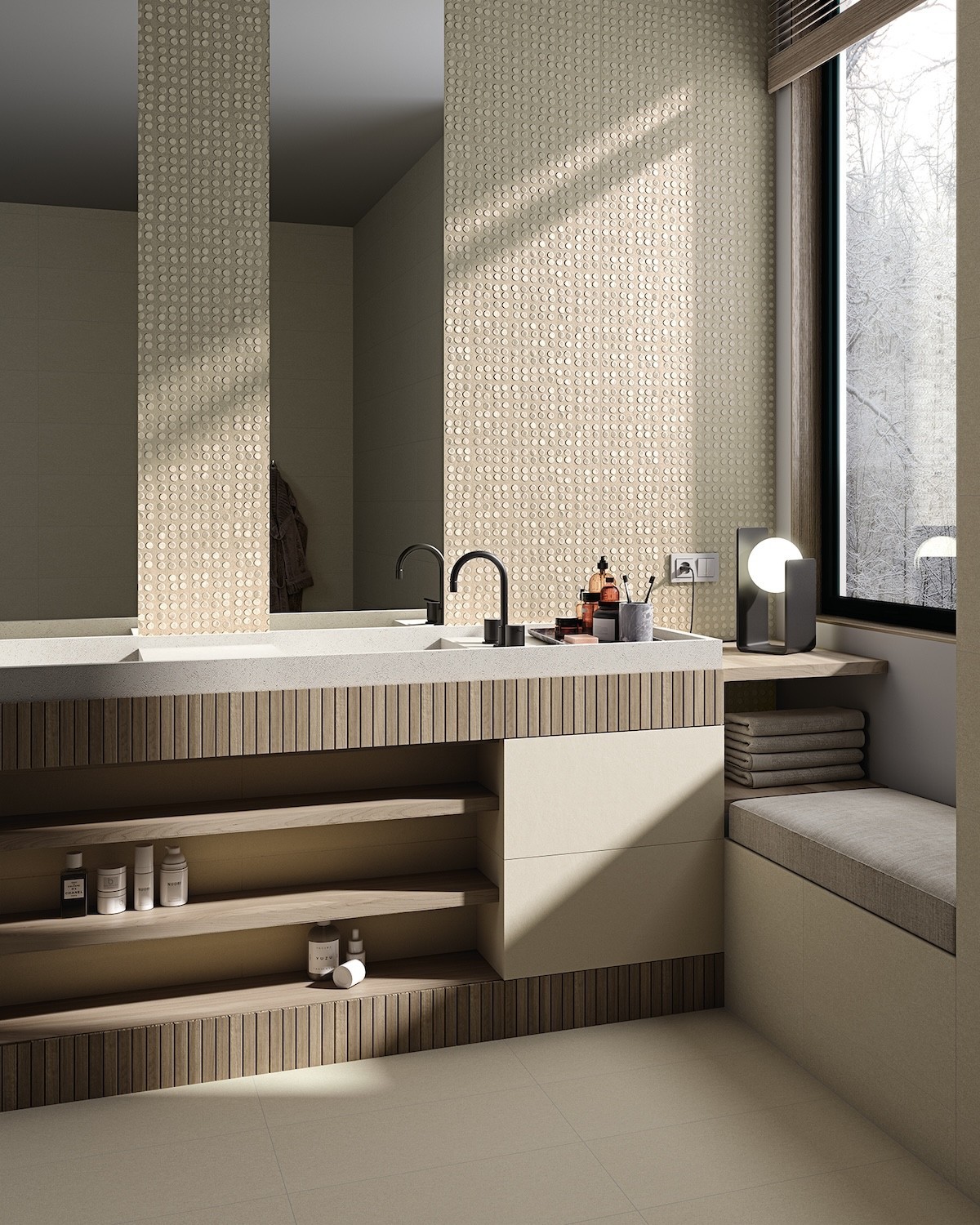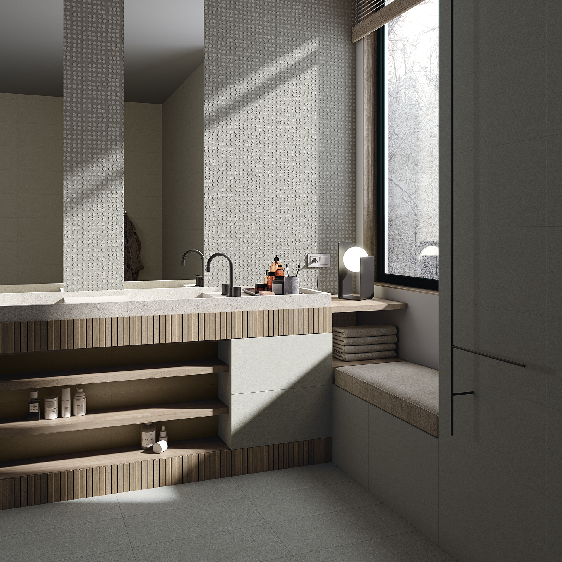 La colección DUO encarna la tendencia actual de ambientes relajados, continuos y neutros. Sus colores atemporales y la variedad de formatos y relieves posibilitan combinaciones infinitas: desde suelos uniformes de gran formato hasta mezclas dinámicas con mosaicos en zonas de agua, nichos o paredes de ducha. Los formatos versátiles y piezas de coordinación permiten resolver todo el proyecto desde una única colección, reforzando la coherencia visual.