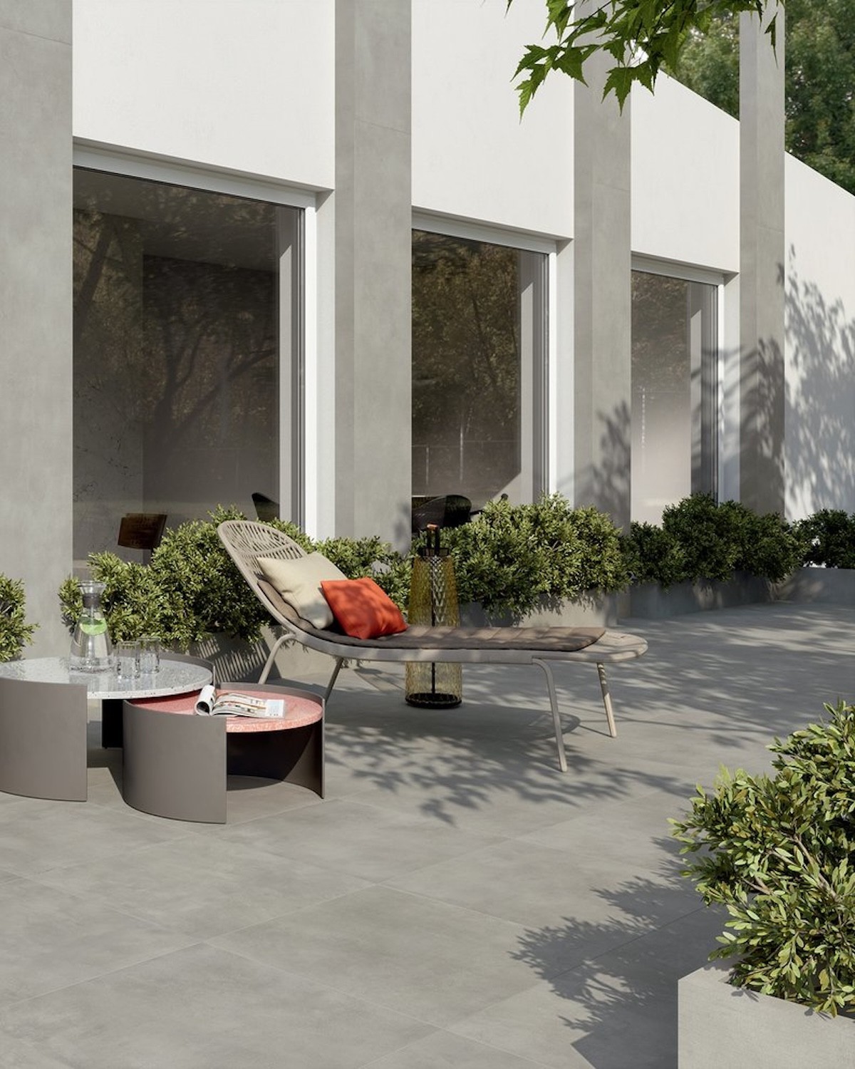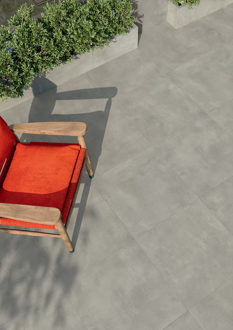 Multiforme de Marca Corona en version épaisseur 20 mm est conçue pour répondre aux exigences de l’extérieur : résistance, stabilité et sécurité, sans renoncer à une esthétique contemporaine haut de gamme. Avec son effet béton mat, la collection permet de créer des terrasses et espaces outdoor au style architectural, épuré et intemporel, idéal pour les maisons modernes et les projets contract.