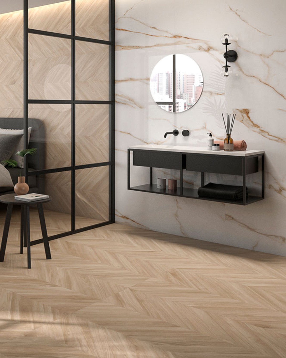 Une collection en trois couleurs où un effet bois naturel est créé. La collection crée une continuité entre les pièces pour créer un système continu sans sans où les joints sont intégrés dans la conception graphique.