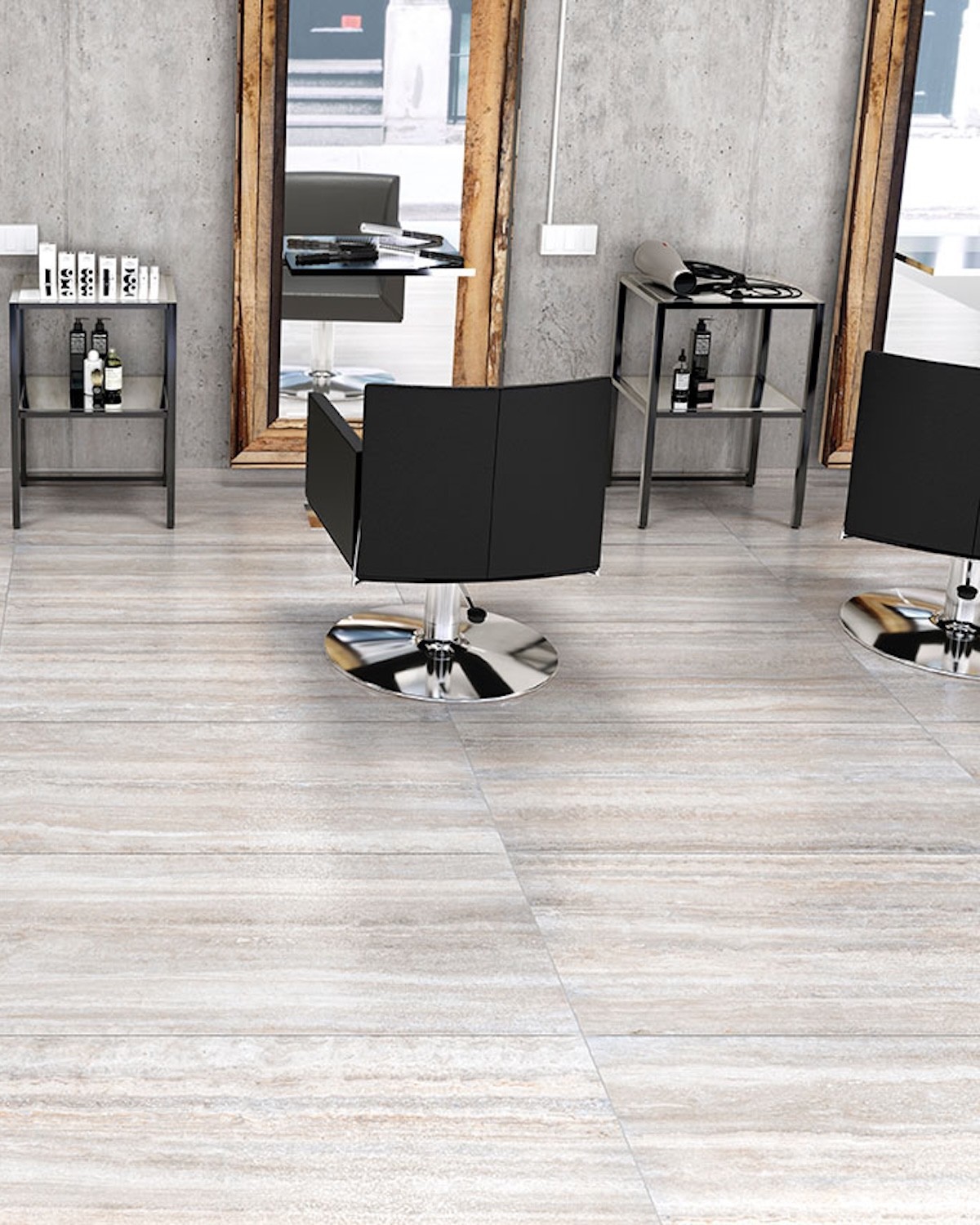 Grâce à ses formats rectifiés, la collection permet de réduire au minimum les joints, en renforçant l’effet de grande dalle en pierre. Les carrelages en grès cérame Dolomia Vein Cut s’installent aussi bien au sol qu’au mur et s’intègrent facilement aux grandes surfaces continues : pièces de vie décloisonnées, halls d’entrée, open space, zones jour et nuit ou couloirs à la recherche d’une esthétique fluide. Les formats rectifiés sont particulièrement adaptés à la pose avec joint fin, mettant en valeur la linéarité des veines qui se prolongent d’un carreau à l’autre.