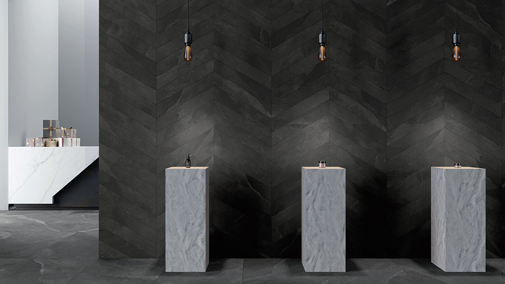 La série est disponible en cinq teintes raffinées : Ivory, Almond, Mid Grey, Dark Grey et Anthracite. Chaque couleur offre une variation graphique V4, rappelant l’irrégularité subtile de la pierre naturelle et apportant profondeur et dynamisme aux sols et murs.