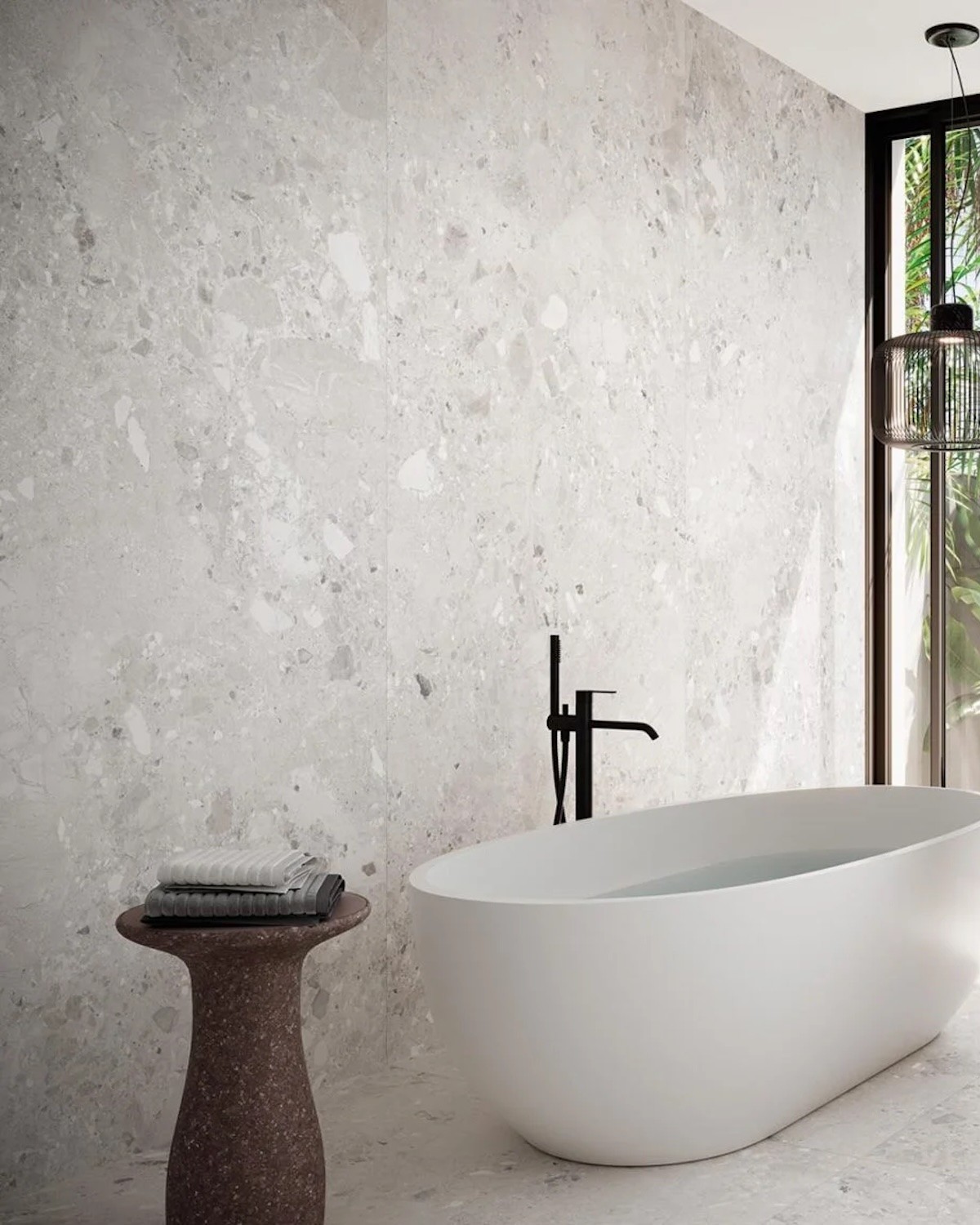 La collection Ura Infinita de Navarti propose une interprétation raffinée et contemporaine de la pierre naturelle. Avec sa surface mate, ses détails minéraux subtils et son esthétique inspirée des roches sédimentaires, cette série en grès cérame BIa est conçue pour créer des espaces élégants, lumineux et à forte présence architecturale.