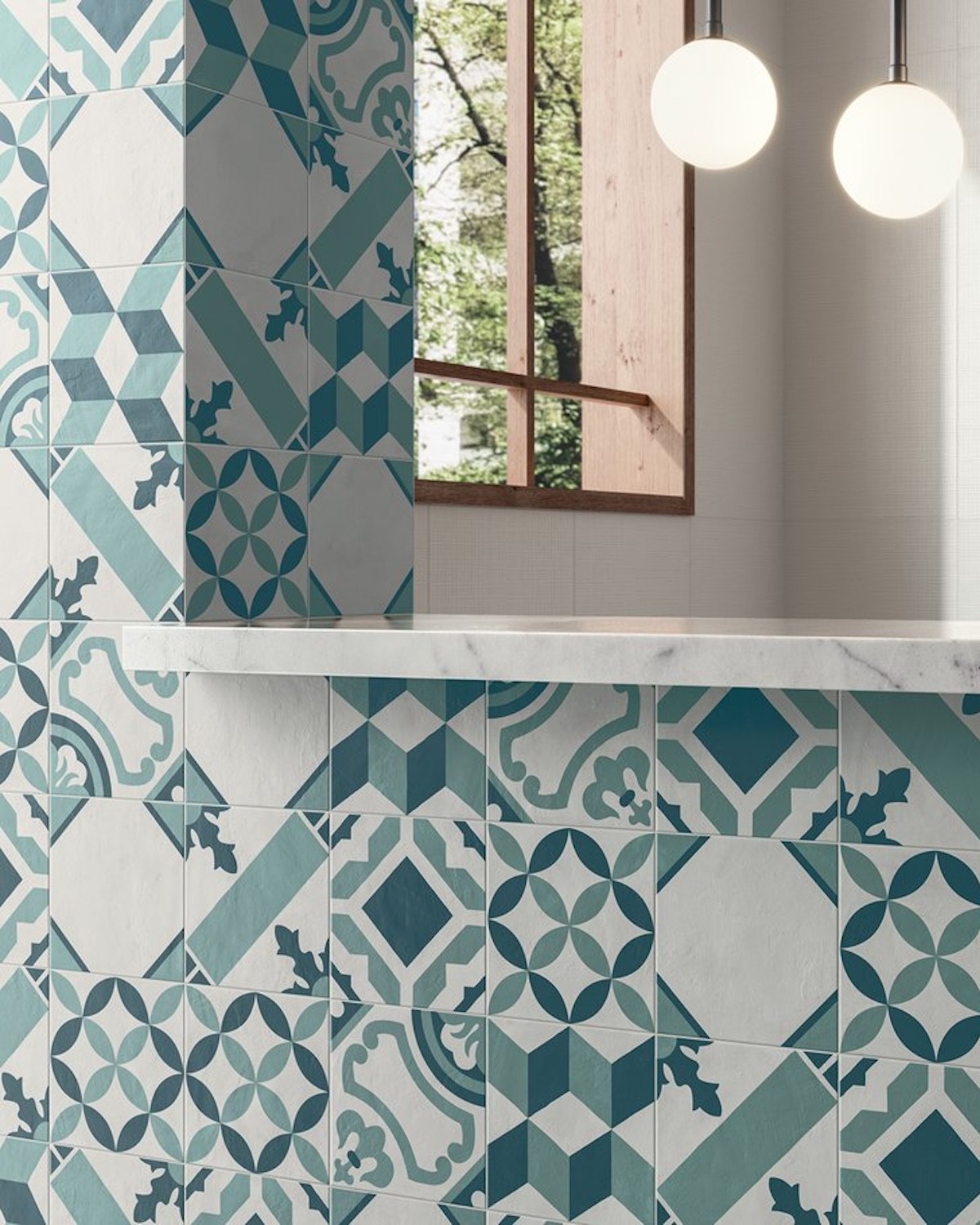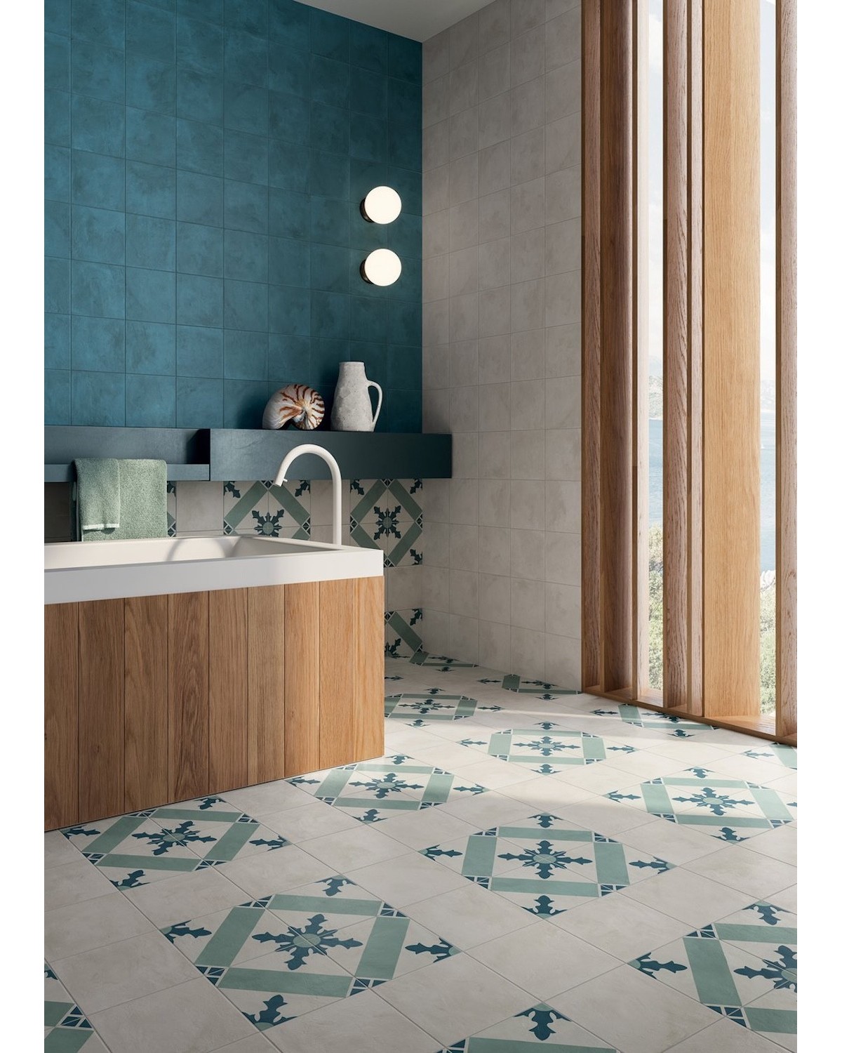 L’association des carreaux décorés avec des carreaux unis de la même collection permet de concevoir des projets équilibrés, mêlant zones sobres et accents décoratifs avec une grande liberté de composition.