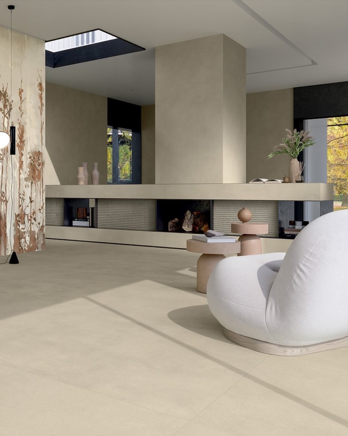 Tufo apporte une nuance plus terreuse et méditerranéenne, très élégante. Une option idéale pour salons et entrées, avec un béton chaleureux sans assombrir l’espace.