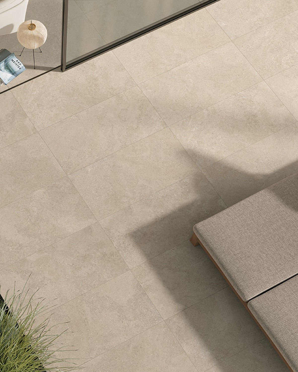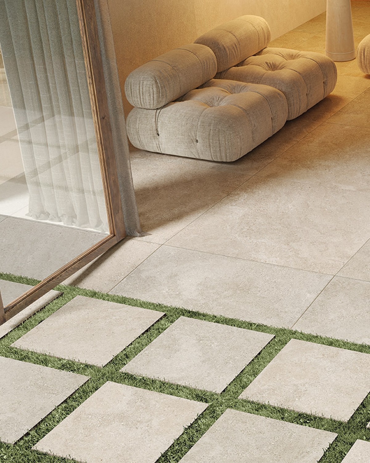 The soft texture and lightly structured surface evoke the handcrafted feel of natural stone, ideal for creating organic, serene, and seamless indoor–outdoor transitions.