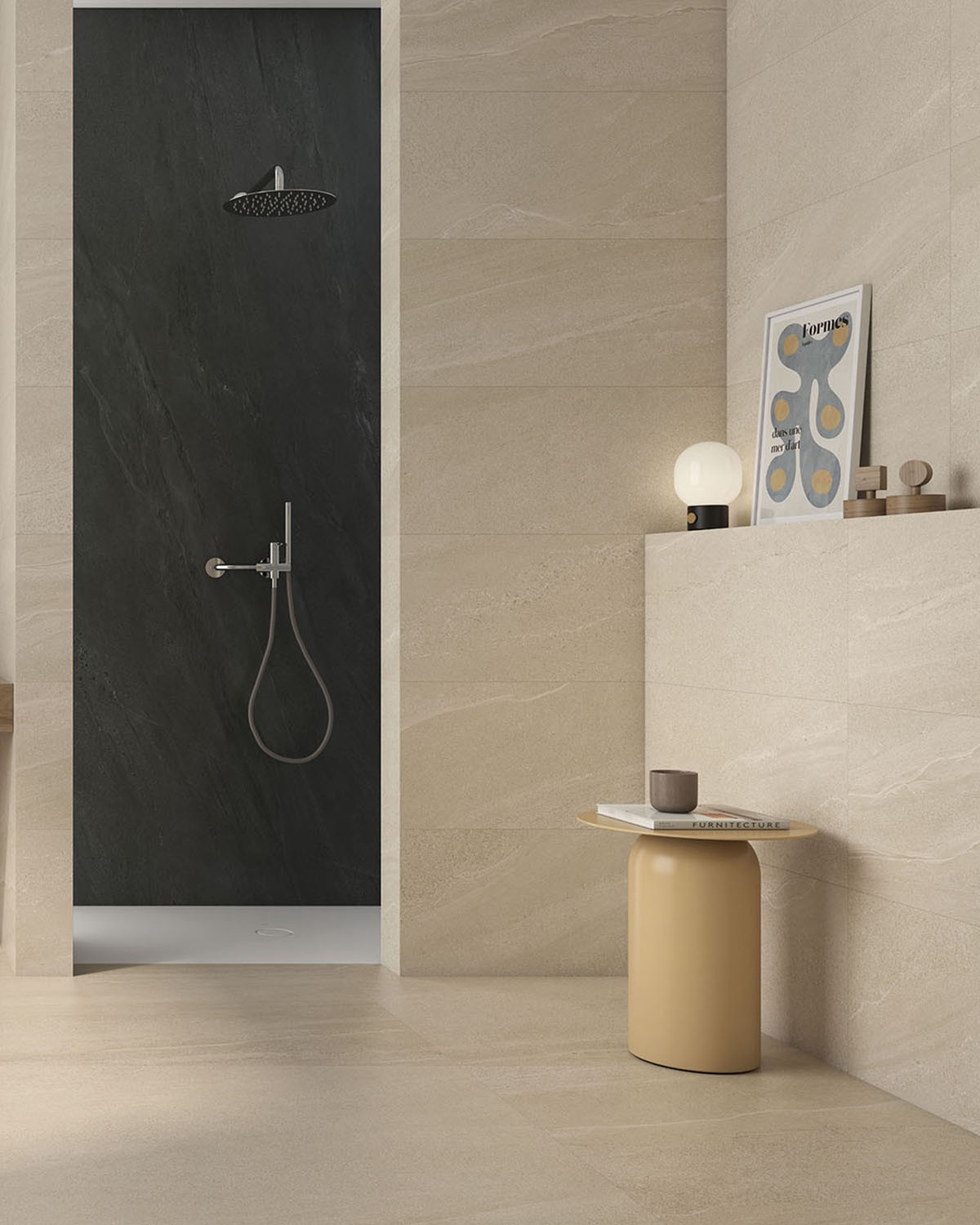 In line with the latest trends in interior design, Eddystone stands out for its large format and natural stone appearance , a staple in modern architecture. The purity of its neutral tones allows it to be integrated into both warm, Mediterranean-inspired spaces and urban projects with an industrial aesthetic.