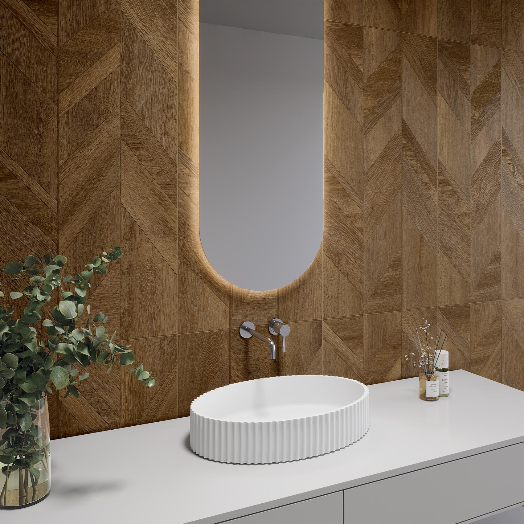 Oken responds to major contemporary interior design trends that emphasize naturalness, large formats, and inspiration from noble materials like wood. Its geometric design, featuring nodes and graphic assemblies, updates the classic concept of marquetry and adds a touch of exclusivity . Ideal for creating warm, bright, and highly decorative environments, Oken adapts to both minimalist styles and luxury projects, providing timeless distinction.