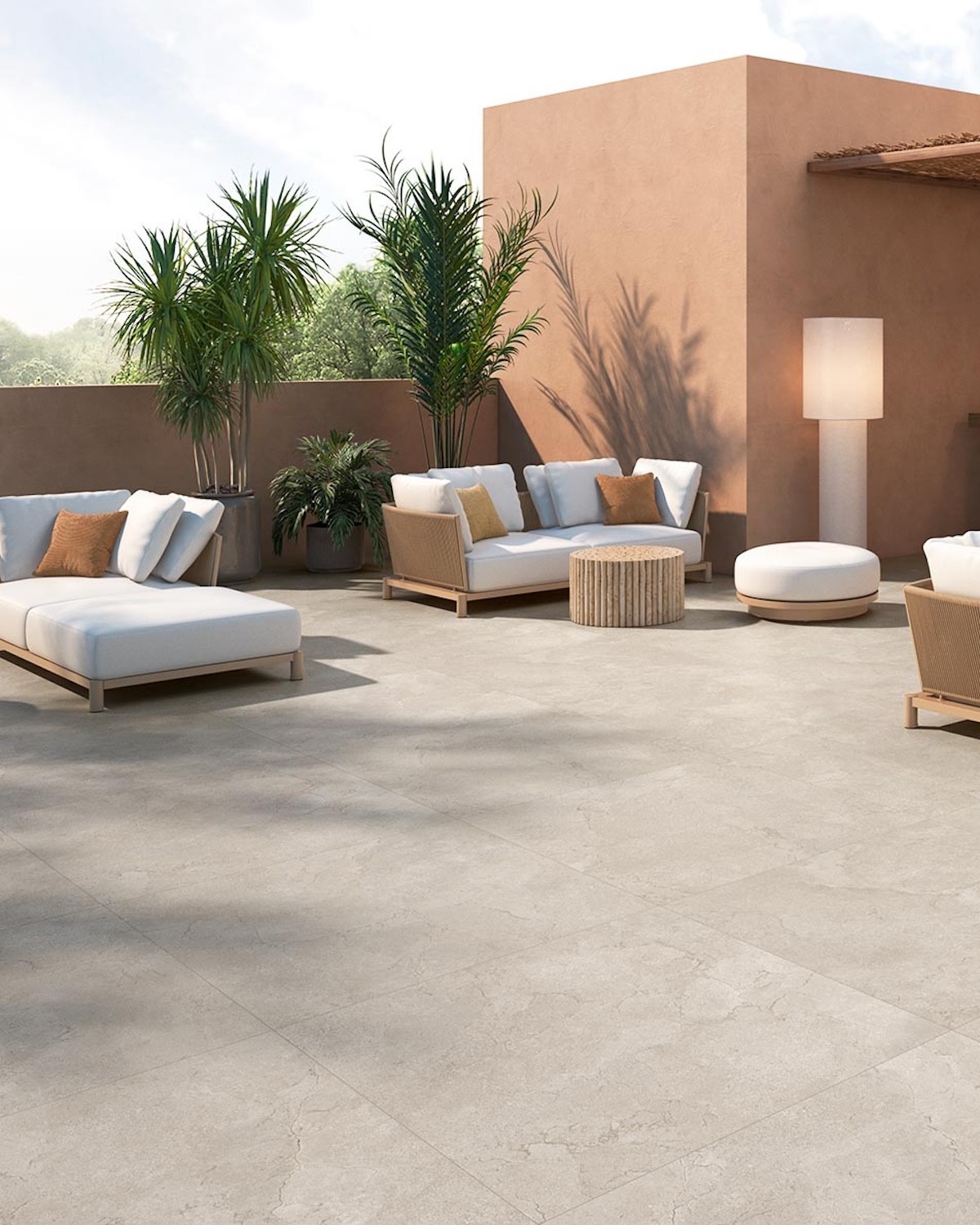Domus Cream is available in a single, refined color that offers versatility and timelessness. It comes in four main sizes : 59.5x59.5 cm, 59.5x119.2 cm, 90x90 cm, and 120x120 cm. All come in a matte finish , except for the Grip+ (R11/C/Class 3) versions in 90x90 cm and 120x120 cm, ideal for outdoor use or in high-traffic wet areas, ensuring visual continuity between the interior and exterior. The series features a V3 (medium) color variation and a BIa group for maximum strength and durability.