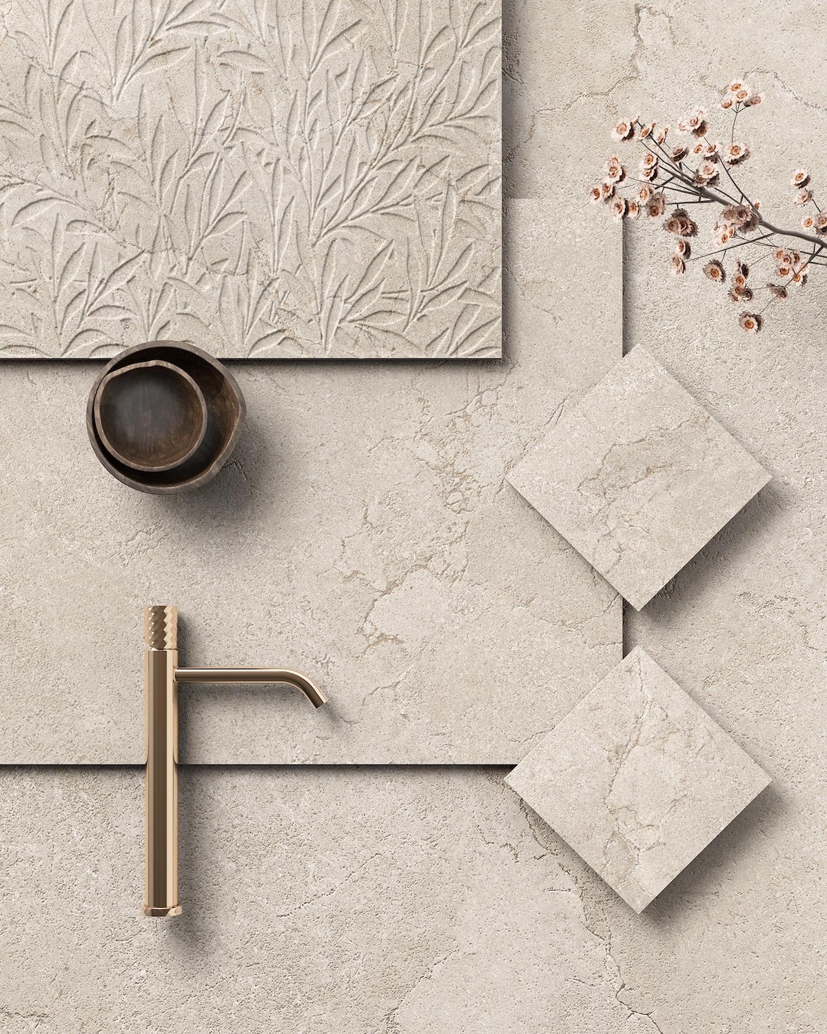 Domus reinterprets Crema Marfil stone in light of current interior design trends: large formats, soft hues, and elegant minimalism. The Decor botanical relief responds to the demand for natural textures and discreet ornamentation on designer walls. Its application fits both modern and classic environments that seek to enhance light and serenity without sacrificing personality.